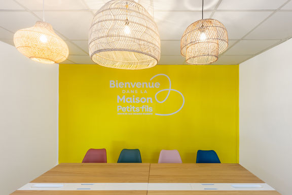 La décoration joue avec les couleurs et les visuels imposés par la franchise Petits-fils, et permet de créer des espaces chaleureux, joyeux et lumineux, alors que les locaux ne bénéficient pas d'une luminosité naturelle importante.